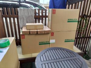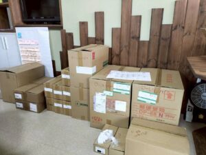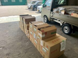 仮倉庫、事務所内と今は荷物でいっぱいですが